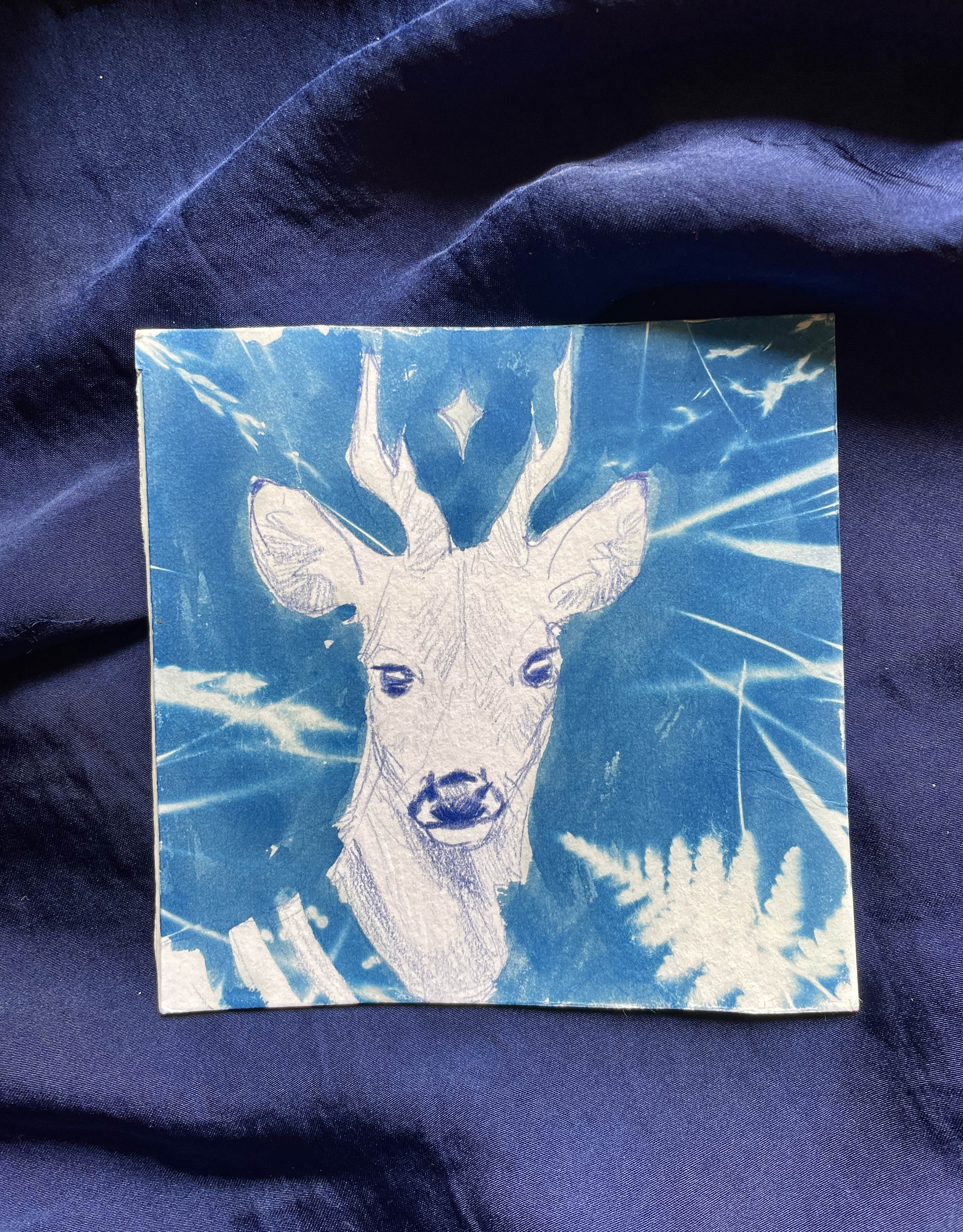 A collection of animal sketches nestled amongst cyanotype printed plants
